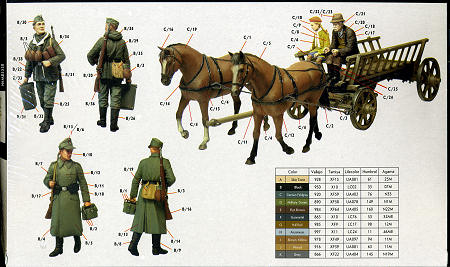 The other two figures are a pair of walking soldiers each with slung rifles and carrying various things. It is as if they had just gone to get provisions. Both are looking in the same direction as if checking out or talking to the young female passenger. The back of the box provides the instructions for building the horses and other figures as well as a color guide in several paint brands.