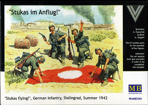Here is another of Master Box's neat story-telling figure sets. This one contains four figures from the Summer of 1942. They are laying out a flag to show the dive bombers where the front lines are located so they don't accidentally bomb their own troops. One figure is concentrating on laying out the flag. The other three are looking up with one pointing out the in-coming aircraft.