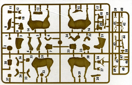 As you can see, the parts are all on a single sprue with the horses taking up a considerable amount of space. Assembly is shown on the back of the box along with the painting guide, and one has considerable leeway on the tracker's mount in terms of colors and markings. Army horses were mostly chestnut in color. A number of different paint options are provided.