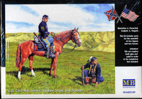 This is the first kit of which I'm aware in Master Box's new series on the US Civil War. The kit includes two figures and two horses. The mounted figure is a Union Soldier while the unmounted one is an Indian Tracker. This second figure has his horse nearby while he checks out the ground for signs of troop movement. I'm going to have to assume that this would be in the western US as I'm not sure how many native trackers were used east of the Mississippi.