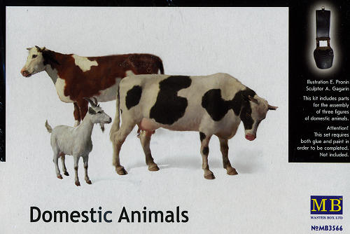 Moo-ving on to something a bit more pastoral, Master Box has provided us with some properly scaled domesticated animals, concentrating on common ruminants. Included in the set are two cows in various positions and a goat. These figures are not festooned with accessories so no rifles or backpacks here. In fact, there are only around two dozen parts. The back of the box provides some painting suggestions.
