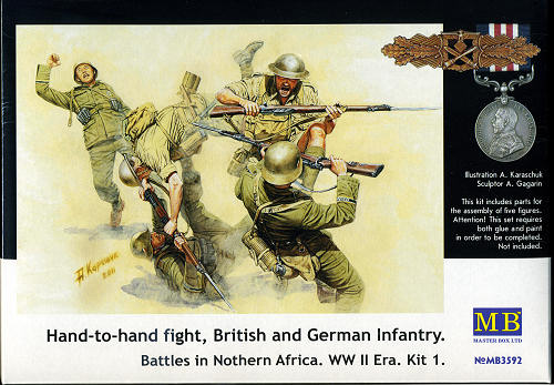 This is yet another of Master Box's interesting and a bit off beat figure sets. This one is for British and German soldiers in hand to hand combat somewhere in North Africa. There are two British and three German soldiers in this set. As you can see, it seems the British are the attackers and the Germans the defenders with one German soldier having been knocked out of the way. These are in pairs so to speak with one pair having both armed soldiers clashing their rifles. The other has the British soldier being booted over the top of the German lying on the ground. All of these are on a single, well molded sprue. I have to say that action poses like this are some of what make Master Box stand out from the others.