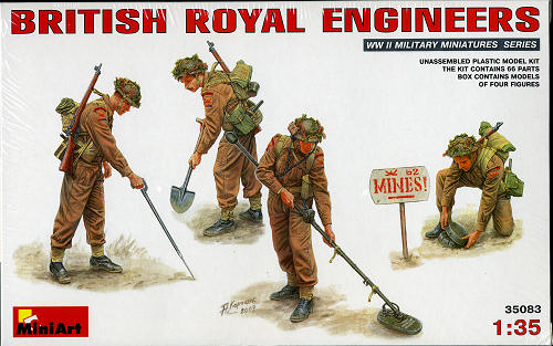 This latest figure set from MiniArt is a set of British WWII era engineers. These four figures are all performing some sort of task with one soldier manning a shovel while the other three are either scanning, probing or disarming mines, not exactly the safest job in the world but one that is critical in any army. The set also includes the sign as shown on the box art.