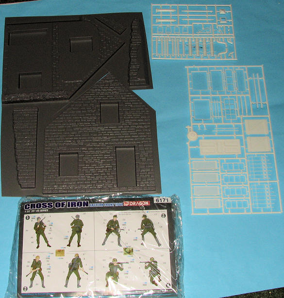 This is another of MiniArt's fine diorama pieces. This time it is just the front and a small section of the side of a house. No base and with only four pieces of vac plastic to cut and assemble, should be an excellent project. The vac plastic is good and thick to make it easy to cement. There are enough parts on the plastic sprues to not only complete this project, but also to add to your spares bins. As you might guess, these are common sprues.