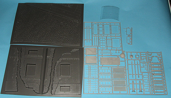So much for the description. For the kit, you are presented with two light grey injected plastic sprues and two sheets of thick vacuformed plastic. This is a great way to do the building and street bits as to have them in styrene would have meant some very heavy pieces. The vacuformed bits are both the inside and the outside of the corner section. Into and onto these bits are placed the various injected plastic parts in the form of the windows, downspout and the lamp post. A sheet of acetate is included for you to cut out the lamp bits using a template and for the 'glass' in the windows. Of course, you'll want to make some of these look like they are broken and you'll also need to strew around a lot of debris. As MiniArt tends to use common sprues, there are a lot of parts that won't be used with this one, such as a garden gate, wrought iron fence bits, window shutters and a front door amongst them. Add them to your spares bin for later projects.