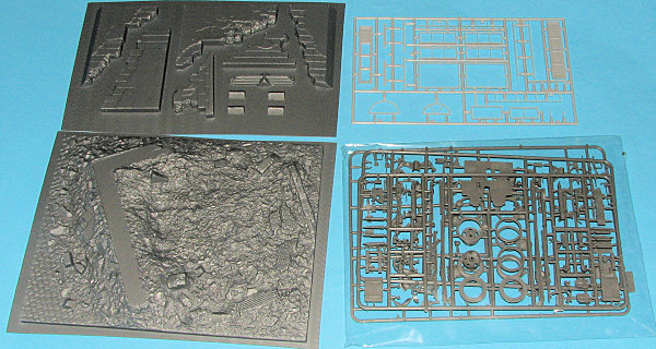 MiniArt continues with its innovative and interesting diorama bases with this complete diorama kit. You get a building corner section and base made from thick, vacuformed plastic. There is an injected sprue to go with the base that includes some door and window frames, all to be used a detritus on the street.