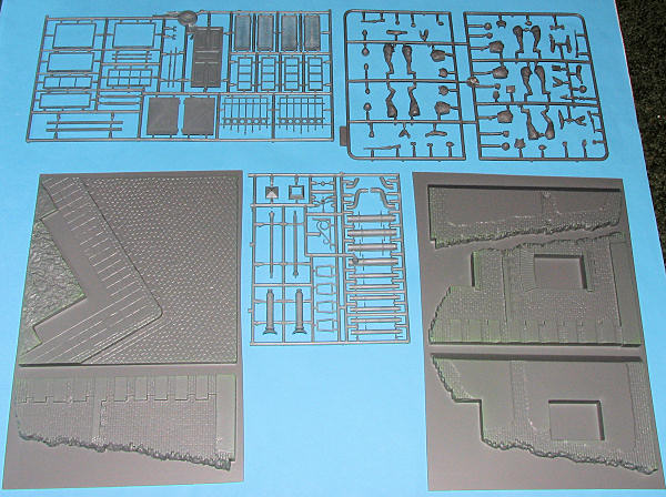 This particular set is about as simple as one can get. There is a brick street base with some rubble where the inside of the house would be. Then the inner and outer walls of the corner of a house. These are the parts molded in vacuformed plastic. One simply cuts out the sections along with the window areas, and cements them together using standard glues. There are two of MiniArts many generic 'house pieces' sprues to provide any other bits that are needed. I should mention that several of the large pieces, like the door and window shutters, have ejector pin circles on them that will need to be removed or hidden from sight during construction.