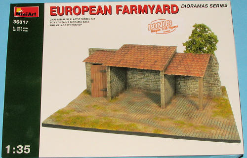 Here is another of MiniArt's fine vacuformed diorama bases. This time, it isn't something that has been knocked into rubble, but a rather complete European Farmyard. Actually a sort of stable with an attached shed. As you can see from the box photo, it has a tile roof and stone walls with a stone courtyard that is overgrown with weeds. The track in front of the structure is depresses as if a lot of wheeled traffic has gone through there over the ages.