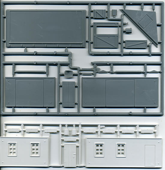 The kit itself contains four identical sprues in grey and one in white. The four identical sprues are basically a long and short wall with a half roof section and end insert. Two of these will make for a full structure. These have the openings already marked on the inside and are what you'd use for the barn structure. Simply opening one of the holes will allow the large door to be installed.
