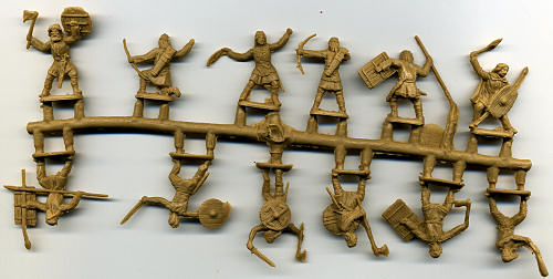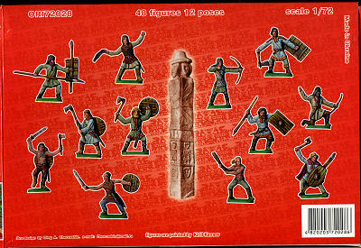 The set is molded in a brown, semi-flexible plastic that is the norm for figure sets of this type. There are four identical sprues, each containing 12 figures in different poses with different weapons, though short swords, axes and shields seem popular with the locals. The figures are well molded and will require little clean-up. For the most part, painting is generally done with acrylics. There are no instructions and no specific painting guide, though there are painted figures shown on the back of the box. As nice as those are, I think I'd prefer painted drawings.