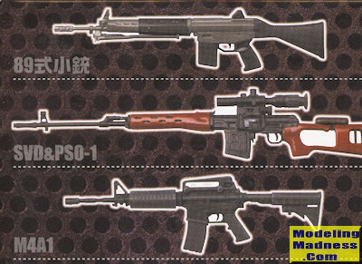 What you get are three different rifles, the Howa Type 89, the Russian Dragunov SVD with the PSO-1 scope, and the US M4A1 carbine. All of the kits are molded in black and you get two of each rifle. Most of these are very simple and consist of a minimal number of parts. The Type 89 comes with a couple of options, one being an extended or retracted bipod and the other a solid or light-weight stock.