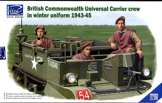 This particular set by Riich Models is completely titled British Commonwealth Universal Carrier Crew in Winter Uniforms 1943-45", but seemed to be a bit long to fit as the header. As described, it contains three figures to fit into a Universal Carrier or Bren Carrier. Designed undoubtedly for the Riich kit of this vehicle, these figures should fit into any 1/35 kit of this vehicle. Actually, they could be used in a variety of other situations where seated figures are needed. There are three figures included in the set and these are shown on the box art.