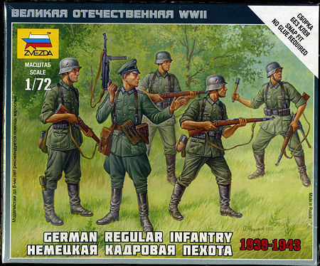 Adding to their ever-expanding sets of wargaming figures, we have this one from Zvezda. This set is five German army infantry figures. There are five regular soldiers and an officer in this set. These five figures all have separate arms or weapons. Those with separate weapons have the ends of the arms molded to the weapon with the attachment point on the chest of the figure. The set includes the usual base and for all five and what look like two smaller two-figure bases. At least, that is what I think those are.