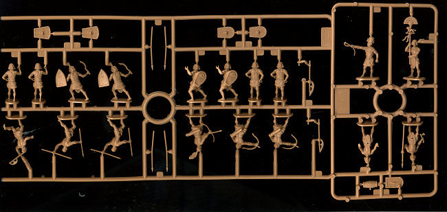 The set is in a pinkish semi-soft plastic and contains three identical sprues along with one smaller sprue. The identical sprues contain Swordsmen, Spear Men, a Javelin thrower, and axemen. Most of the actual combat was hand to hand so one would think there would be more axemen and swordsmen. There are actually either six or three of each figure. The single figures are the General, Standard Bearer, Musician and one Spearman with his shield on the ground as if protecting the General.
