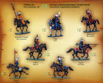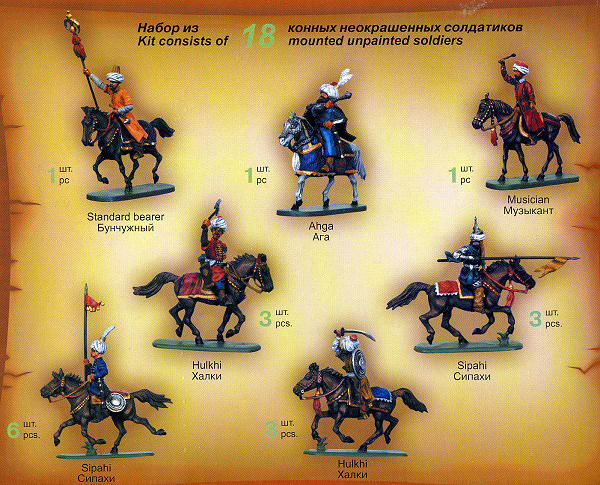 There is no time-frame provided on the box, but I'd have to think 16th or 17th century if not earlier as I see only blade or pummeling weapons in the hands of the various figures. Those who have seen Zvezda's figures know that they are quite well molded and need little more than brief assembly and painting to be ready to use. This particular set has 18 mounted figures. There is a single figure of the Standard Bearer, Ahga, and Musician. Six Hulkhi in two poses and Nine Sipahi, also in two different poses. I'll let you do the google thing to look up what these names mean and to give yourself a bit of an education, but can tell you that one batch are lance armed while the others have hand weapons.