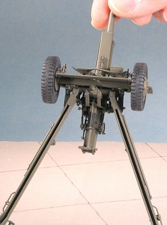 Back at the frame, I attached the two tow bars and put on a few bits like wheel brake handles. This was followed by attaching the gun to the frame. Careful gluing will allow the gun to move in asimuth and in elevation. There is a spring-like assembly on the bottom that sort of snaps in place allowing elevation. The gun shield (as opposed to the chassis shield already on) was then glued in place. The braces fit well, but much care needs to be taken when attaching all the bits to make sure they do not interfere with each other. I can honestly tell you that I wasn't fully prepared for all the fiddly work that putting this kit together takes, but it can be done and by doing little bits at a time, I was able to get everything into place.