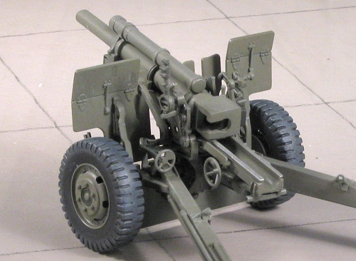 Vallejo acrylics. Not real heavy. A bit of aluminum dry brushing was also done. I did a heavy job on the top of the recoil frame and on the teeth for the elevation and azimuth gears. Generally the gun is pretty clean. The last thing I did was to give the gun an overall matte clear.