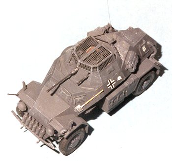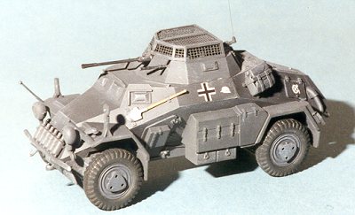 The Sd.kfz 222 is part of a family of light armored cars that started with the 221. Prototypes of this series were initially developed around1937 and were produced until 1942. However these useful vehicles were used until the end of the war. The main difference between the 221 and the 222 was in the weapon carried. The 221 had a a seven sided open topped turret with a single7.92mm machine gun. Later in the war, a 2.3 cm anti-tank rifle replaced the machine gun. The 222 (and subject of this kit) had a ten sided open topped turret with a 20mm anti-tank gun in addition to the machine gun.