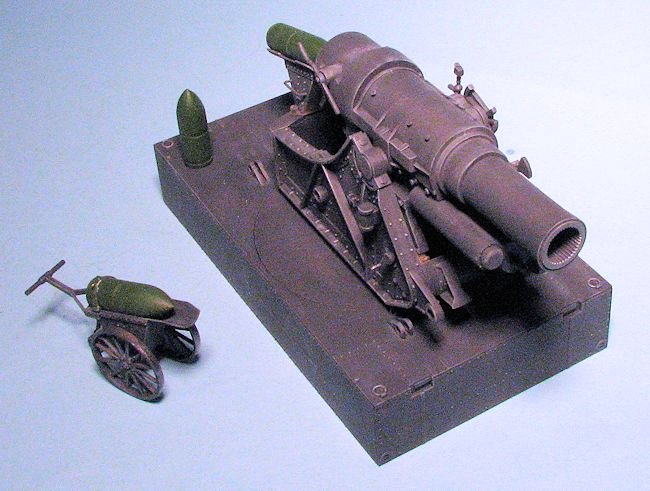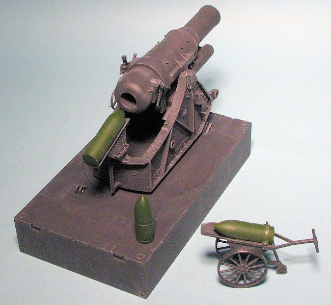 I used Tamiya XF-63 German grey for the scheme and during this time, I also assembled the shell trough that fits on the back and the shell cart along with the three shells that came with the kit. The trough was painted, the mating surfaces scraped and it was installed along with some additional touch-up. The cart was also painted German grey, though the shells were painted FS 34102 green. There are quite a few images to be found on this gun if one searches diligently and just about all of them looked to be dark grey. Some of them had the breech area in steel, but most had it in dark grey. I then dry-brushed the whole thing with Vallejo sky grey acrylics to bring out detail. Were I good at weathering, I'd add rust, but I'm not.