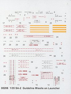 Instructions are quite good and offer the usual well drawn construction sequences. Many of the parts are named. No painting information is provided until the final decal stage. The colors given there are both Model Master and Gunze references. One has a choice of two color options: one is Egyptian with the launcher in Desert Yellow and the missile in Light Nary Grey (yeah, there are a number of interesting spelling errors), stian (whatever that is) in white aluminum. The Russian version has a Russian Green launcher and Light Grey missile. The guide also mentions that the North Vietnamese version is in these colors, but there are plenty of references that show that the North Vietnamese camouflaged their equipment. The decal sheet is very well printed and has all the usual data markings.