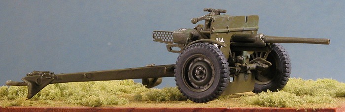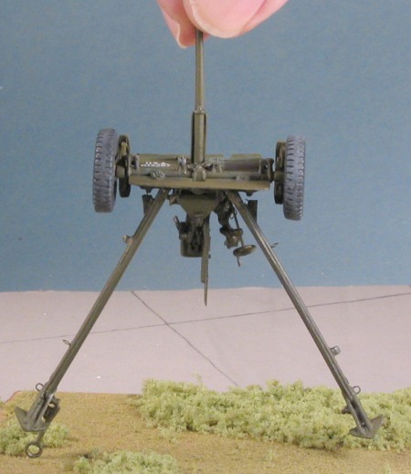After the usual wash and drybrushing (I used light green and light grey for this), there was little actual assembly left to do. I glued on the main wheels first as I wanted to have things as level as I could. Then, because I wasn't sure if I was going to have this as part of a towed scene with a jeep or not, I attached the trailing arms with white glue and made sure that things were as level as I could get them. Naturally, they weren't. Guess the only thing to do with these guns is to glue them to the base! I should point out, that since this kit was based on a museum model, it is missing things. There are no shoulder guard guide, no grab handles on the rear (I used some tow line guides that were on the generic etched fret that came with the kit), and no rammers that normally fit to the sides of the trails. These are the kinds of detail parts that are normally missing from museum pieces