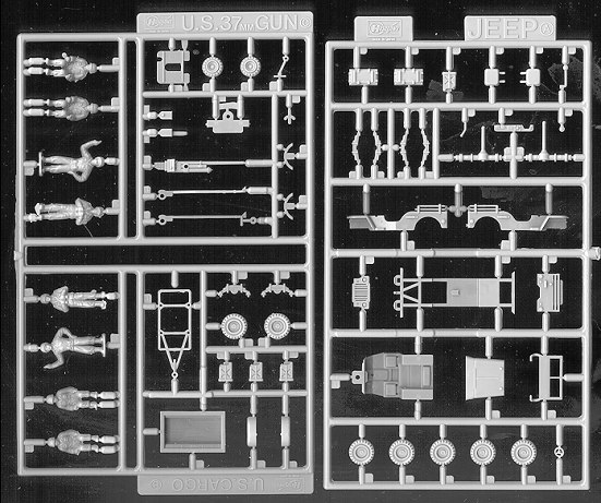 Though the date on the box is 1991, I have to think that this kit has been around for a LOT longer than that. Hasegawa got into 1/72 military vehicles in the late 1960s and early 1970, producing a fine line of products that are still very nice. Parts are well molded and while not quite as crisp as one would expect from a totally modern kit, it is still very well done. Flash is minimal as are sink marks. That cannot be said of ejector pin marks as nearly every part has at least one if not more on one side. Every figure you see has been 'shot in the back'. While many of these marks will be invisible once built, there are many that will not. Particularly difficult to remove will be those on the underside of the chassis and those that are inside the fenders.