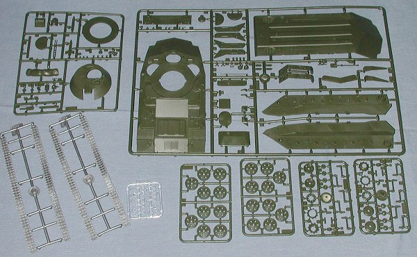 This Zvezda kit is molded in an olive drab plastic. Unlike the earlier kit previewed, this one had its sprues in plastic bags, however the bags were not sealed so the parts were able to rattle around in the box. Like the earlier Panzer III kit, the parts are crisply molded with no flash, minimal sink areas and almost no ejector pin marks in areas where they will be seen after construction. There is no interior, nor does it appear that the gun can elevate, however, the turret can be made to rotate. Tracks are vinyl and strangely, they come in two sections per side. Why they were not made in one piece is a bit odd.