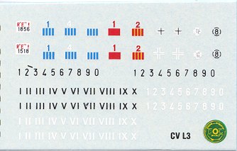 The instructions are very well done in several well-drawn construction steps with each part being unambiguously shown. No painting info is provided during construction. There are guides for three different vehicles. The first is the box art CV-33 in tan with some green as used in Libya during 1941. Next is an overall sand one from 1944 in Torino, and finally a darker sand and green version from Corsica in 1942. All three of these are shown in color on the back of the box. There is also a color chart located there providing matches in Lifecolor, Humbrol, Tamiya, Gunze, Testors, and Molak. The decal sheet is well printed and provides a wide variety of markings to be used on these tankettes. Using the reference mentioned in the historical section will allow the modeler to choose just about any vehicle used, though he'll be on his own in terms of camo.