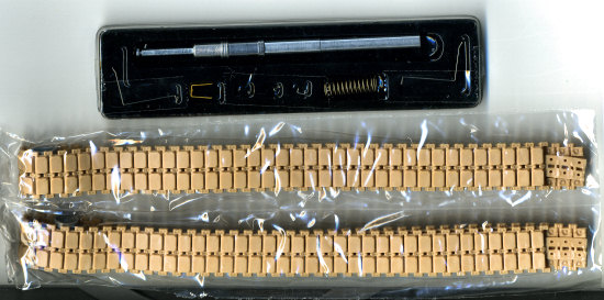 Cramming all those parts into even this large box is difficult, but they are all there. A set of the excellent one-piece tracks are included. I used these on a smaller scale vehicle and found they not only glue well, but will hold any paint you put on them without flaking off. Good thing as the guide teeth are separate parts that need to be added. The kit includes a machined