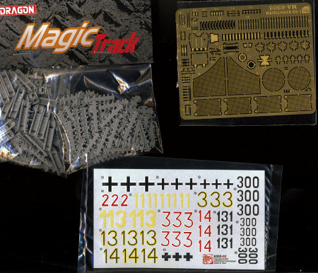 As we have now come to expect from Dragon, this is a full multimedia kit. It includes the Magic Track individual links, an aluminum barrel, wire towing cable, and two etched frets that are mostly for the intake screens, hold downs and