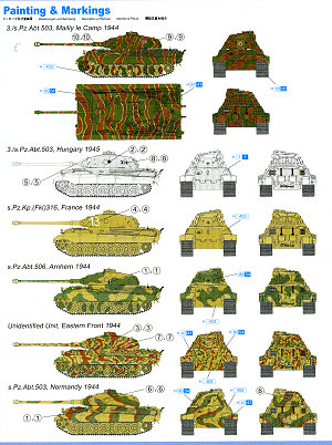Assembly seems to be rather easy as there are only 8 construction steps, each illustrated in the photo-realistic style that seems to be gaining popularity. It is also in color. There are a few places where one has to open up some holes and a couple of detail sections will help quite a bit with getting the bits properly located. Preliminary painting information is also provided using Gunze and Model Master references. Apparently the King Tiger did not have rubber edged road wheels, so those of us who despise painting these items will be pleased with this.