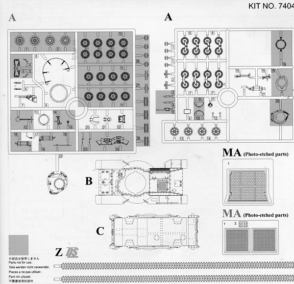 The kit itself is still very well molded with crisp details and hollowed out main gun barrel. This kit has the DS tracks which are quite flexible and easy to paint and glue. Instructions are a single folded sheet with five construction steps. No color info is provided during the build, with all that offered on its own page and in full color. The only tank provided is the box art vehicle. Just about all these tanks were too late to see combat except for a few in Manchuria and Korea that were used against the Soviets in the last days of the war. The tank is in the standard green, brown and tan disruptive scheme. The small decal sheet proved impervious to scanning as all the characters are in white on a very light blue background.