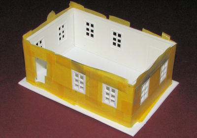 Once that was done, the walls were then glued to the base with plenty of cement. Then, they were painted a white then masked so I could paint the windows. Meanwhile, the roof was painted a brown and then lightly airbrushed with a tan color to hopefully give a contrast. No way would I be able to duplicate the thatched roof as shown on the box art. Back at the walls, the windows were painted green. You do have to mask everything to keep overspray from being a problem unless you hand paint the windows.