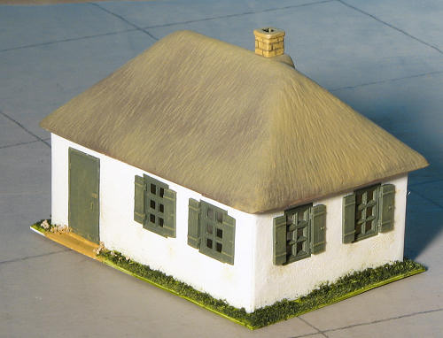 I then painted the base around the house with a green using a tan for the area in front of the door. Then I used Woodland Scenics grass over the green area, installing it with white glue. For in front of the door, I tried some gravel, but it looked too large so I removed it and just painted more tan. I also used this shade to dry brush all the windows, shutters and door in an attempt to add a bit of interest. The chimney was painted black on the inside and before it dried, I used some tan for the chimney itself, using the still wet black to help smear things a bit. The brick pattern was added with a pencil. And that was it.