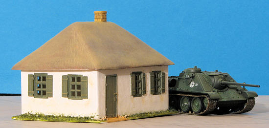 MiniArt has been known for its superb 1/35 diorama scenes. These have been heavy gauge vacuformed plastic for the base and main structures and injected styrene for the detail bits. This is one of their first 1/72 diorama features and it is a single East European style house with a thatched roof. This house would be useful for dioramas from WWII back several hundred years and possibly even today where thatching is still considered a valid method for roofing.