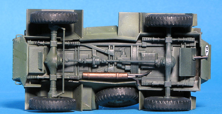 over plates as well as the four wheel drive drivetrain. Each of the differential/axle housing pieces is a single piece as is the drive shaft/transfer case piece. One then attaches the venders and upper suspension arms (for the front axle). Wheels are typical of what I have seen in Tamiya's 1/48 kits with an outer section that includes the outer wheel part and most of the tire. A rear insert contains the rest of the sidewall and wheel. These simply glue onto the axles. No poly caps with this one.