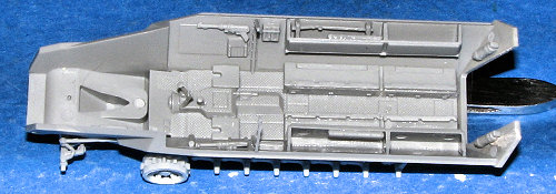 Some of the parts of this are quite small and I also found that the instructions were somewhat vague in a few spots. This was probably as much to my lack of knowledge of the subject as any fault of the instructions. I'm willing to admit to that. So what I did was to look for subassemblies. Basically, I found that one could build up the interior minus the seats, guns and steering wheel as all those parts were given the same color as the outside. I also painted the side sponsons and fenders separately. This was a bit of a mistake. Hindsight says that I should have glued those in place first as they all fit rather close together.