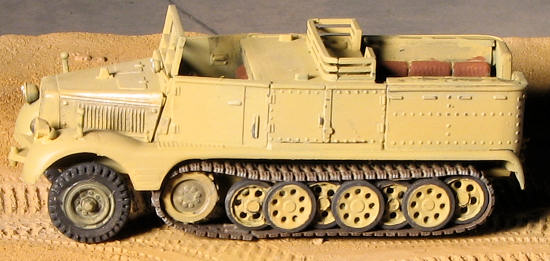 The SdKfz 11 was powered by a Maybach NL38 TUKR or HL42 TUKRM 6-cylinder engine having a top speed of 53 kph for a 250 km range. The standard version was mainly used to tow light artillery weapons such as the 37 mm and the 105 mm along with ammunition. A very rare specially designed multi-door version was produced for engineer battalions. All versions saw heavy use on all fronts. Often this vehicle was called upon to pull more than its design load, a job it generally performed with minimal problems.
