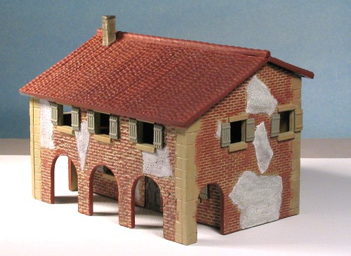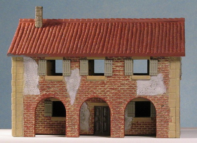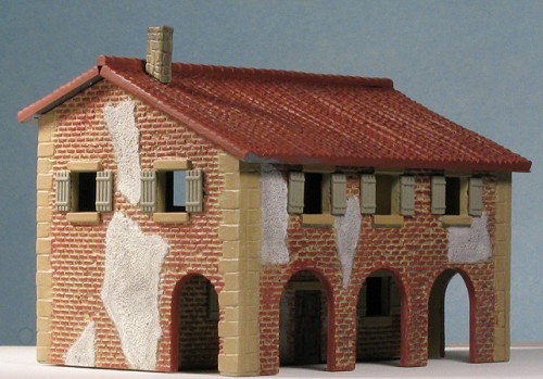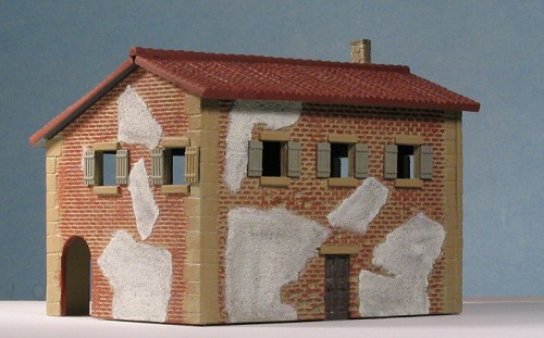 I did paint the overall house with a sandy sort of shade. The roof was painted with a reddish-brown shade. Inside, I painted the floor an auburn shade and the inside walls were painted panzer yellow. These interior colors were just sort of slopped on to give the impression that they were some shade other than grey plastic. Those wanting to add detail to the interior rooms will have to do a marathon hole filling session as each window has 8 of them surrounding it.
