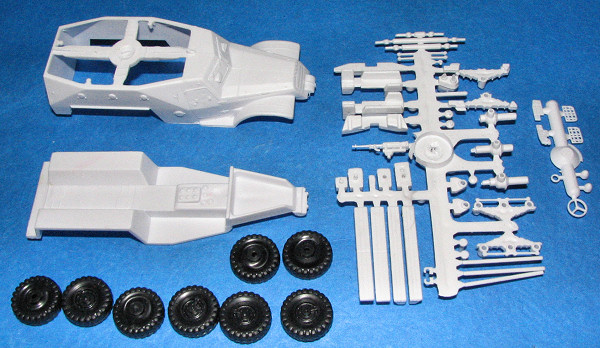 Molded in white with the wheels in black plastic, there really is little to this kit as compared to some other military models in this scale. The molding is fairly good, though many of the parts have ejector pin stubs with flash and some rather large sink areas were noted on a few of the bits. The dashboard is particularly badly done and some filler will be needed to fix this. I also noted that the back of each of the wheel/tire parts was deformed, though not enough to cause any mounting problems. Every kit I've seen with these wheels is the same. Most of the ejector pin marks won't be seen but some will so be prepared.