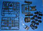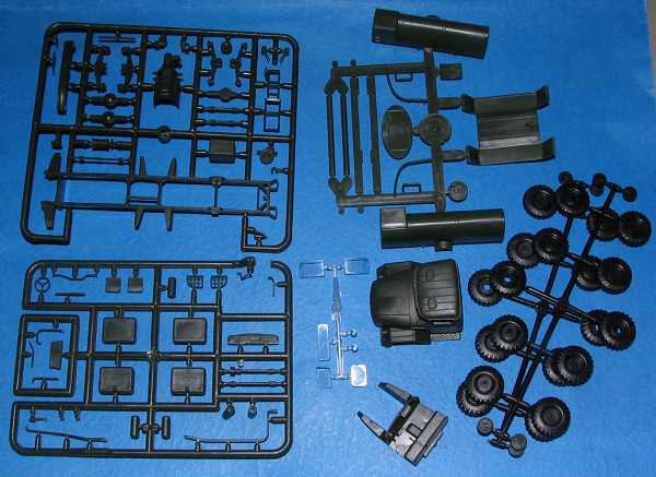 Molded in a dark green and black plastic, the quality of the molding is actually very good. I found a few sink areas, but nothing major. Some flash was present as well and a few delicate bits were broken due to the banging around of the sprues in the bag. Detail level is as good as I've seen in any 1/72 vehicle kits. Apparently this base vehicle is used for a number of other kits as several parts are not used with the fuel truck. The large two-piece tires are well molded and should be quite convincing. There is not a full engine, but the lower engine, exhaust, and suspension/drive train are complete.