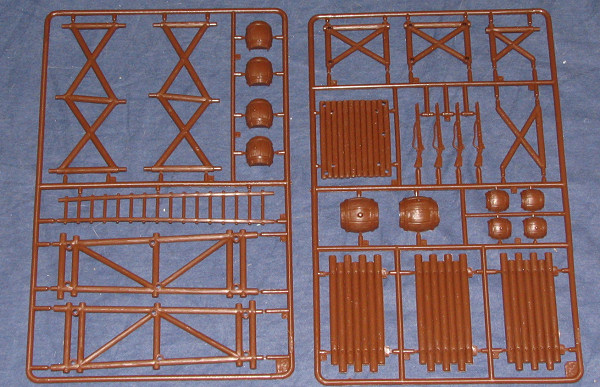 What you have in this set are four sprues of softish brown plastic. There is duplication of both sprues so only two are shown in the image. The set includes parts for a watch tower, a three sided emplacement of some sort, five barrels of different sizes and four rifles. As you can see, the emplacement and watch tower are wooden, which would make it from the time period mentioned before.