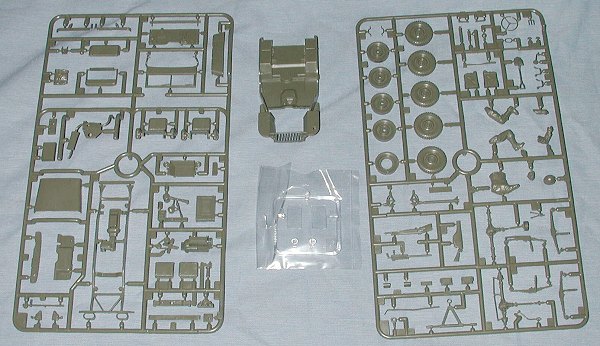 This is not the older Jeep model that I can recall seeing many years ago. The date on the instructions is 1997 and the improvements of the kit (other than the improved price) are most welcome. In fact, you get a full bore, open things up and look at everything kit. No curbside for this one. It has a complete engine and opening hood as well as a windscreen that can be folded down. Option bits include a 50 cailbre machine gun on a post (sort of like 'Rat Patrol'). There is also a tow bar or a wire cutter for the front if so desired. In addition to the full engine, a full suspension is given. A single figure of a rather laid back driver is provided as well.