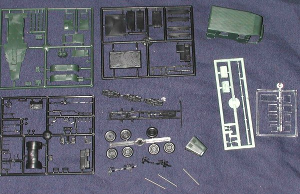 Upon opening the box, one is confronted with a variety of colored sprues that harkens back to the days of Matchbox! Basically in green and black, the parts are well molded and flash free. There are ejector pin marks, but most of them are either on the 'back side' of the parts or easy to remove so they should not present a problem. There were no sink marks that I could see upon initial inspection.
