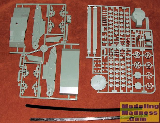 The molding of the kit is actually quite good without any flash though I did spot several sink areas on thicker pieces. Ejector pin marks seem to be limited to the inside of big items. The kit is a curbside without any interior detailing. Likewise, all the hatches are molded closed. The hull is made up of a lower section with two side pieces. The suspension bits are rather complex and I'd say that a good 70% of the kit's parts count is related to these.