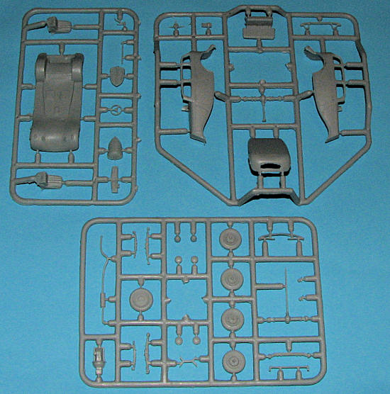 Ace continues to produce interesting subject in a near short run format. By that, I mean that they use a lower pressure molding from companies like Revell and as a result, there is some light flash on the three grey plastic sprues. The kit provides a chassis piece that includes the front and rear fenders as well as the fuel tank. There are separate leaf sprungs, a lower engine piece and the requisite fore and aft axle/differential assembly. For the interior there are two separate front seats and a rear seat. Gear shift and steering wheel are included though no pedals (which you wouldn't see anyway. I found some detritus on the rear seat that will need to be cleaned up if one wants. The body itself is composed of three pieces; a right, left and top section. There are acetate pieces to be used for the clear bits.