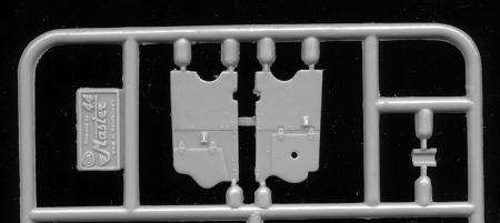 elevated or flat. There doesn't seem to be any intermediate position available. To make this a late version, this boxing includes a new section of sprue that includes two shields and the cross brace (shown at right). Otherwise, it is identical to the earlier kit. I have to assume that one would not use the 'early' version trailer suspension on this one.