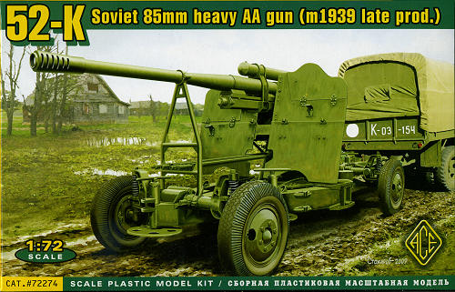 The 85 mm air defense gun M1939 (52-K) (Russian:85-мм зенитная пушка обр. 1939 г. (52-К)) was an 85-mm Soviet air defense gun, developed under guidance of leading Soviet designers M. N. Loginov and G. D. Dorokhin. This gun was successfully used throughout the Great Patriotic War against level bombers and other high- and medium-altitude targets. In emergencies they were utilized as powerful anti-tank weapons. The barrel of 52-K was the base for the family of 85-mm Soviet tank guns. Crews of 85-mm AD guns shot down 4,047 Axis aircraft. The mean quantity of 85-mm ammunition required to shoot down one enemy plane was 598 rounds. After the war some 52-Ks were refitted for peaceful purposes as anti-avalanche guns in a mountainous terrain.