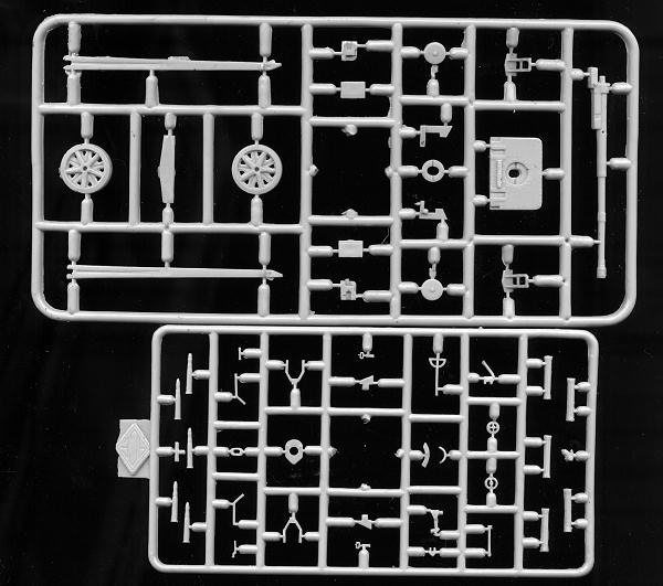 The grey plastic is about average softness and so no worries about taking huge gouges out of it if your hobby knife slips. There are several parts that are not shown in the construction sequence. These appear to be ammunition rounds and cannisters. The molding on the parts is quite good. Not as crisp as on, say, a Tamiya kit, but not bad, either. Aside from the usual mold seams, there are no molding glitches. I did notice a couple of small parts that had broken from jostling around in the bag, but a quick glue should make those right. I did not see an option to build this in the towed position but perhaps that is just a matter of gluing the trails together at the rear.