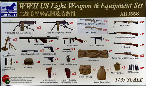 Well this latest set from Bronco will meet the needs of just about anyone who wants US weapons and equipment. One gets two of just about everything with several accessories provided in larger numbers. As you can see on the box art, there is a lot of stuff. For instance: